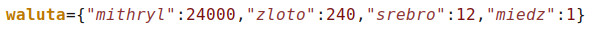 waluta={"mithryl":24000,"zloto":240,"srebro":12,"miedz":1}