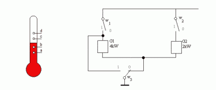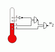Przykładem automatu kombinacyjnego jest układ sterowania temperaturą. Pomiaru dokonujemy termometrem kontaktowym podający cztery sygnały: a, b, c, d, w 0 - jeśli temperatura jest niższa lub 1 - jeśli wyższa.