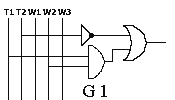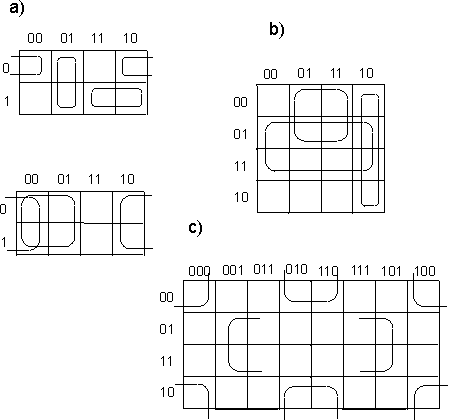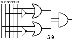 Ukaład posiada 2 grzejniki ( G1=4kW; G2=2kW ). Grzejnikami można sterować przy użyciu trzech wyłączników oznaczanych literą w (odpowiednio w1, w2 itd.). Zmienne wyjściowe w są funkcjami zmiennych wejściowych a, b, c, d. Funkcje te noszą nazwę funkcji przełączających, gdyż zarówno zmienne jak i funkcje mogą przyjmować tylko dwie wartości: 0 lub 1. Funkcje te nie są w pełni określone, gdyż nie wszystkie ciągi wartości zmiennych mogą się pojawiać na wejściu układu, lub też dla niektórych ciągów wartość zmiennych sygnału wyjściowego jest obojętna ( np.w3 dla abcd=1111). w2=F2(a,b,c,d) w3=F3(a,b,c,d) Ciąg wartości zmiennych będący ciągiem 0-1-wym może być traktowany jak liczba binarna; możemy też posługiwać się jej odpowiednikiem dziesiętnym (np. dla funkcji opisuj1cej w2). Dla określenia funkcji należy wypisać zbiór ciągów wartości zmiennych, dla których funkcja równa jest jedności oraz zbiór, w którym funkcja przyjmuje wartości 0. Ponadto dla funkcji nie w pełni określonych wypisujemy zbiór wartości zmiennych, dla których wartość funkcji jest nie określona. Postacią kanoniczną sumy nazywamy funkcję rozłożoną na sumę iloczynów, w których jako czynniki występują funkcje o liczbie argumentów o jeden mniejszej. Pełny iloczyn n zmiennych, jest to iloczyn zawierający wszystkie n zmiennych w postaci nie zanegowanej lub zanegowanej. Chcąc przedstawić funkcję przełączającą w kanonicznej postaci sumy, dla każdego ciągu ze zbioru F1 piszemy pełny iloczyn, w którym zerom ciągu odpowiadają zmienne zanegowane, a jedynkom - zmienne nie zanegowanej. Podobnie, chcąc przedstawić funkcję przełączającą w kanonicznej postaci iloczynu, dla każdego ciągu ze zbioru F0 piszemy pełną sumę, przy czym zerom ciągu odpowiadają zmienne nie zanegowane, a jedynkom - zanegowane. Możemy również dane wyrażenia poddać uproszczeniu stosując prawa algebry Bool'a - taką formę wyrażenia uproszczonego nazywamy wyrażeniem normalnym. Minimalizacja funkcji przełączających - cd. przykładu 2Tworzymy tablicę dla, przykładowo, przełącznika w2: ![]() uzyskując funkcję w2= a negacja lub b i d negacja Poniżej pełny opis sposobu tworzenia i minimalizacji w takiej tablicy: Minimalizacja funkcji przełączającej polega na przedstawieniu jej w postaci normalnej, zawierającej możliwie najmniejszą liczbę zmiennych w celu ograniczenia ilości bramek niezbędnych do stworzenia danego układu. Początkową postacią funkcji jest albo tabelka wartości funkcji przedstawiona w postaci tzw.tablicy Karnaugha, albo zbiory F1, F0, FZ ( 1,0,Z - wykładniki ) ciągów wartości zmiennych, dla których funkcja przyjmuje wartość 1, 0 oraz nie określone. Minimalizację funkcji przełączających niewielkiej liczby zmiennych (do 5,6) najdogodniej jest przeprowadzić na tablicy Karnaugha. Tablica ta stanowi specyficzną odmianę tablicy wartości funkcji. Z boku tablicy wpisujemy wszystkie ciągi wartości dwu pierwszych zmiennych a, b - a u góry - wszystkie możliwe ciągi wartości pozostałych zmiennych c, d. Ciągi wartości zmiennych przedstawione są w takiej kolejności, że sąsiednie ciągi różnią się wartością tylko jednej zmiennej (ciągami sąsiednimi są również ciąg pierwszy i ostatni). W klatkach tablicy wpisujemy wartość funkcji przełączającej dla odpowiednich wartości argumentów. Jeżeli funkcja jest nie określona dla pewnych wartości zmiennych, to w tych miejscach tabelki stawiamy kreskę. Iloczyn czterech różnych zmiennych lub ich negacji (pełen iloczyn) przyjmuje wartości 1 dokładnie w jednym polu takiej tablicy. Iloczyn trzech zmiennych przyjmuje wartości 1 w dwóch polach, które albo sąsiadują ze sobą, albo leżą przy przeciwległych krańcach tablicy ( w obu przypadkach będziemy takie pola nazywać sąsiednimi). Wynika to z przyjętej kolejności ciągów wartości zmiennych a, b i c, d opisując tablicę. Iloczyn dwu zmiennych przyjmuje wartość 1 zawsze w czterech polach tablicy, zajmujących cały rząd pionowy lub poziomy albo tworząc kwadrat, leżący całkowicie wewnątrz siatki lub przechodzący przez jej klejone brzegi. Iloczynowi jednoczynnikowemu odpowiada osiem pól, leżących w dwu sąsiadujących ze sobą rzędach. ![]() Przykłady tworzenia grup w tablicach KArnaugha zależności: