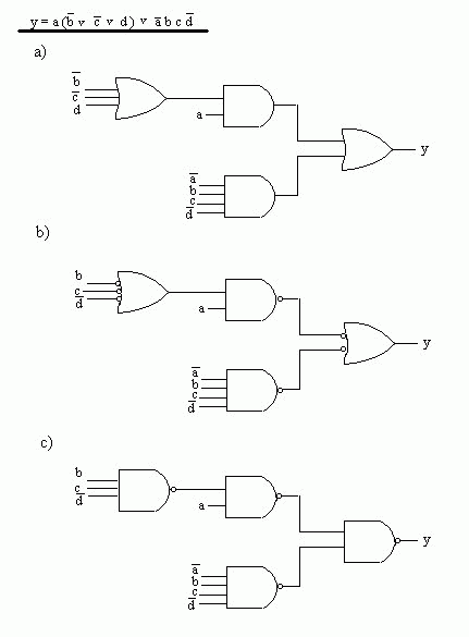 Element NOR realizuje funkcję negacji sumy oraz iloczynu negacji, a element NAND - funkcje negacji iloczynu oraz sumy negacji. Ponieważ element NAND realizuje zarówno negację iloczynu jak i sumę negacji zmiennych, i ma podwójne oznaczenie, wpisanie funkcji przełączającej realizowanej przez układ NAND jest bardzo proste. W układzie takim należy ponumerować kolejno warstwy (poziomy) elementów poczynając od wyjścia układu, po czym elementy NAND znajdujące się na poziomach nieparzystych należy narysować jako sumy negacji. Wówczas, pamiętając, że negacja na wyjściu elementu znosi się z negacją na dołączonym do niego wejściu, łatwo napisać funkcję realizowaną przez układ. ![]() Przy syntezie układu złożonego z elementów NAND, realizującego daną funkcję przełączającą, należy narysować realizację danej funkcji na elementach sumy i iloczynu (rys. a), a następnie zastąpić iloczyny przez negacje iloczynów, a sumy przez sumy negacji , dodając jednocześnie negatory lub zanegowując zmienne wyjściowe, tak aby realizowana funkcja nie uległa zmianie (rys.b). Otrzymany układ jest złożony z elementów NAND. Niekiedy dla ujednolicenia schematu wszystkie elementy NAND rysujemy jako negacje iloczynu (rys. c). Realizacja układów kombinacyjnych przy użyciu bloków funkcjonalnychDowolny układ kombinacyjny może być zrealizowany przy użyciu pamięci stałej ROM, w której zapisane są tablice funkcji przełączających opisujących ten układ. Na wejścia adresowe pamięci podane są zmienne wejściowe, a wyjścia pamięci są wyjściami układu. Przy użyciu multipleksera z m-bitowym adresem można zrealizować dowolną funkcję przełączającą m zmiennych. Realizacja funkcji m zmiennych nie wymaga dodatkowych elementów. Używając tylko negatorów można zrealizować również dowolną funkcję m+1 zmiennych. Chcąc zrealizować wielowyjściowy układ kombinacyjny, opisany zespołem n funkcji przełączających tych samych zmiennych, trzeba użyć multipleksera komutującego słowa n-bitowe ( lub n multiplekserów 1-bitowych). Bibliografia