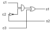 | WstępUkład kombinacyjny jest układem przełączającym (automatem cyfrowym) służącym do przetwarzania sygnałów dwuwartościowych. Sygnały wejściowe układu mogą pochodzić z czujników, wyłączników, przycisków itp. Sygnały wyjściowe mogą sterować np. lampkami sygnalizacyjnymi. Stan wyjść układu kombinacyjnego zależy tylko od aktualnego stanu wejść. Charakteryzuje się brakiem pamięci, która umożliwiłaby zapamiętywanie poprzednich stanów wejść.Zatem: wyjścia układu kombinacyjnego zależą (sa funkcją) tylko od wejść. ![]() Układ przełączający można przedstawić w postaci bloku, mającego wejścia x1, x2, xn i wyjścia y1, y2, yn. Każde wejście może być w jednym z dwóch stanów 0 lub 1. Ciąg sygnałów wejściowych x1 ... xn określa stan wejść. Podobnie ciąg sygnałów wyjściowych y1 ... ymokreśla stan wyjść automatu. (x1, x2 ... xn)=X Przykład 1 - łatwiejszy - "na chłopski rozum"wymyślony przeze mnie, opisany przez uczniów VI L.O w Gdyni po korektach p. J.ŚmierzchalskiejUkład automatyki Tama na rzece posiada dwie śluzy s1 i s2 do regulacji poziomu wody jak pokazano na rysunku. W zależności od szybkości napływania wody do tamy, nadmiar wody jest spuszczany przez jedną ze śluz lub dwie śluzy jednocześnie. O aktualnym poziomie wody w tamie informują trzy czujniki (c1,c1,c3), które działają w momencie zalania ich przez wodę.