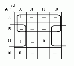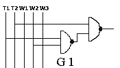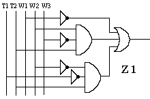 Ukaład posiada 2 grzejniki ( G1=4kW; G2=2kW ). Grzejnikami można sterować przy użyciu trzech wyłączników oznaczanych literą w (odpowiednio w1, w2 itd.). Zmienne wyjściowe w są funkcjami zmiennych wejściowych a, b, c, d. Funkcje te noszą nazwę funkcji przełączających, gdyż zarówno zmienne jak i funkcje mogą przyjmować tylko dwie wartości: 0 lub 1. Funkcje te nie są w pełni określone, gdyż nie wszystkie ciągi wartości zmiennych mogą się pojawiać na wejściu układu, lub też dla niektórych ciągów wartość zmiennych sygnału wyjściowego jest obojętna ( np.w3 dla abcd=1111). w2=F2(a,b,c,d) w3=F3(a,b,c,d) Ciąg wartości zmiennych będący ciągiem 0-1-wym może być traktowany jak liczba binarna; możemy też posługiwać się jej odpowiednikiem dziesiętnym (np. dla funkcji opisuj1cej w2). Dla określenia funkcji należy wypisać zbiór ciągów wartości zmiennych, dla których funkcja równa jest jedności oraz zbiór, w którym funkcja przyjmuje wartości 0. Ponadto dla funkcji nie w pełni określonych wypisujemy zbiór wartości zmiennych, dla których wartość funkcji jest nie określona. Postacią kanoniczną sumy nazywamy funkcję rozłożoną na sumę iloczynów, w których jako czynniki występują funkcje o liczbie argumentów o jeden mniejszej. Pełny iloczyn n zmiennych, jest to iloczyn zawierający wszystkie n zmiennych w postaci nie zanegowanej lub zanegowanej. Chcąc przedstawić funkcję przełączającą w kanonicznej postaci sumy, dla każdego ciągu ze zbioru F1 piszemy pełny iloczyn, w którym zerom ciągu odpowiadają zmienne zanegowane, a jedynkom - zmienne nie zanegowanej. Podobnie, chcąc przedstawić funkcję przełączającą w kanonicznej postaci iloczynu, dla każdego ciągu ze zbioru F0 piszemy pełną sumę, przy czym zerom ciągu odpowiadają zmienne nie zanegowane, a jedynkom - zanegowane. Możemy również dane wyrażenia poddać uproszczeniu stosując prawa algebry Bool'a - taką formę wyrażenia uproszczonego nazywamy wyrażeniem normalnym. Minimalizacja funkcji przełączających - cd. przykładu 2Tworzymy tablicę dla, przykładowo, przełącznika w2: ![]() uzyskując funkcję w2= a negacja lub b i d negacja Poniżej pełny opis sposobu tworzenia i minimalizacji w takiej tablicy: Minimalizacja funkcji przełączającej polega na przedstawieniu jej w postaci normalnej, zawierającej możliwie najmniejszą liczbę zmiennych w celu ograniczenia ilości bramek niezbędnych do stworzenia danego układu. Początkową postacią funkcji jest albo tabelka wartości funkcji przedstawiona w postaci tzw.tablicy Karnaugha, albo zbiory F1, F0, FZ ( 1,0,Z - wykładniki ) ciągów wartości zmiennych, dla których funkcja przyjmuje wartość 1, 0 oraz nie określone. Minimalizację funkcji przełączających niewielkiej liczby zmiennych (do 5,6) najdogodniej jest przeprowadzić na tablicy Karnaugha. Tablica ta stanowi specyficzną odmianę tablicy wartości funkcji. Z boku tablicy wpisujemy wszystkie ciągi wartości dwu pierwszych zmiennych a, b - a u góry - wszystkie możliwe ciągi wartości pozostałych zmiennych c, d. Ciągi wartości zmiennych przedstawione są w takiej kolejności, że sąsiednie ciągi różnią się wartością tylko jednej zmiennej (ciągami sąsiednimi są również ciąg pierwszy i ostatni). W klatkach tablicy wpisujemy wartość funkcji przełączającej dla odpowiednich wartości argumentów. Jeżeli funkcja jest nie określona dla pewnych wartości zmiennych, to w tych miejscach tabelki stawiamy kreskę. Iloczyn czterech różnych zmiennych lub ich negacji (pełen iloczyn) przyjmuje wartości 1 dokładnie w jednym polu takiej tablicy. Iloczyn trzech zmiennych przyjmuje wartości 1 w dwóch polach, które albo sąsiadują ze sobą, albo leżą przy przeciwległych krańcach tablicy ( w obu przypadkach będziemy takie pola nazywać sąsiednimi). Wynika to z przyjętej kolejności ciągów wartości zmiennych a, b i c, d opisując tablicę. Iloczyn dwu zmiennych przyjmuje wartość 1 zawsze w czterech polach tablicy, zajmujących cały rząd pionowy lub poziomy albo tworząc kwadrat, leżący całkowicie wewnątrz siatki lub przechodzący przez jej klejone brzegi. Iloczynowi jednoczynnikowemu odpowiada osiem pól, leżących w dwu sąsiadujących ze sobą rzędach. ![]() Przykłady tworzenia grup w tablicach KArnaugha zależności: