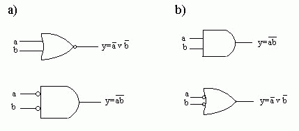 Element NOR realizuje funkcję negacji sumy oraz iloczynu negacji, a element NAND - funkcje negacji iloczynu oraz sumy negacji. Ponieważ element NAND realizuje zarówno negację iloczynu jak i sumę negacji zmiennych, i ma podwójne oznaczenie, wpisanie funkcji przełączającej realizowanej przez układ NAND jest bardzo proste. W układzie takim należy ponumerować kolejno warstwy (poziomy) elementów poczynając od wyjścia układu, po czym elementy NAND znajdujące się na poziomach nieparzystych należy narysować jako sumy negacji. Wówczas, pamiętając, że negacja na wyjściu elementu znosi się z negacją na dołączonym do niego wejściu, łatwo napisać funkcję realizowaną przez układ. ![]() Przy syntezie układu złożonego z elementów NAND, realizującego daną funkcję przełączającą, należy narysować realizację danej funkcji na elementach sumy i iloczynu (rys. a), a następnie zastąpić iloczyny przez negacje iloczynów, a sumy przez sumy negacji , dodając jednocześnie negatory lub zanegowując zmienne wyjściowe, tak aby realizowana funkcja nie uległa zmianie (rys.b). Otrzymany układ jest złożony z elementów NAND. Niekiedy dla ujednolicenia schematu wszystkie elementy NAND rysujemy jako negacje iloczynu (rys. c). Realizacja układów kombinacyjnych przy użyciu bloków funkcjonalnychDowolny układ kombinacyjny może być zrealizowany przy użyciu pamięci stałej ROM, w której zapisane są tablice funkcji przełączających opisujących ten układ. Na wejścia adresowe pamięci podane są zmienne wejściowe, a wyjścia pamięci są wyjściami układu. Przy użyciu multipleksera z m-bitowym adresem można zrealizować dowolną funkcję przełączającą m zmiennych. Realizacja funkcji m zmiennych nie wymaga dodatkowych elementów. Używając tylko negatorów można zrealizować również dowolną funkcję m+1 zmiennych. Chcąc zrealizować wielowyjściowy układ kombinacyjny, opisany zespołem n funkcji przełączających tych samych zmiennych, trzeba użyć multipleksera komutującego słowa n-bitowe ( lub n multiplekserów 1-bitowych). Bibliografia