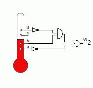 Przykładem automatu kombinacyjnego jest układ sterowania temperaturą. Pomiaru dokonujemy termometrem kontaktowym podający cztery sygnały: a, b, c, d, w 0 - jeśli temperatura jest niższa lub 1 - jeśli wyższa.