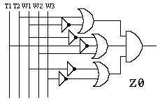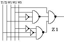 Realizacja układów kombinacyjnych z bramek - cd. przykładu 2W naszym przypadku uzyskujemy bezpośrednio z funkcji w2 (poz.1). Przerabiamy go bez zmiany wartości funkcji by uzyskać postać dogodną do wykorzystania prawa De'Morgana (poz.2) i wykorzystując je uzyskujemy postać oparta na bramkach NAND (poz.3) ![]() ![]()